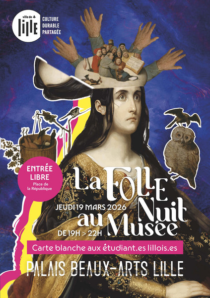 · Nocturne étudiante sur la représentation de la folie (sensibilisation à la santé mentale) avec le Palais des Beaux-Arts de Lille et le soutien de Lillomusées le 19 mars 2026. Des duos d’étudiant.e.s de Patrimoine et musées, de Recherche en histoire de l’art et de la faculté de médecine de l’Université de Lille vont réaliser des visites postées autour d’une sélection d’oeuvre. La nocturne fait partie des actions du PSC 2017-2027[1] du Palais des Beaux-Arts, qui mène une réflexion sur l’offre du musée.